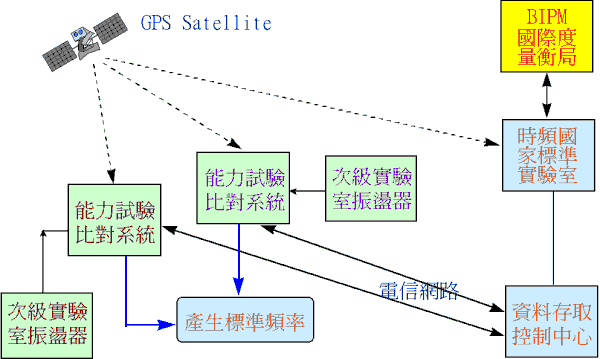 | 振盪器受溫度、老化及其他環境因素影響,其準確度及穩定度常受不同程度影響,因此分隔兩地的振盪器除非特別設置很難確保其間的追溯性。本系統提供一個實驗室間的頻率校正法,其做法是透過GPS(Global Positioning System)共同觀測法找出兩振盪器間的頻率偏離,然後利用所估計的頻率偏離去調整振盪器,使其頻率得以追溯至另一端。這種做法最大的好處是一個廉價的振盪器可以透過本系統追溯至高品質的振盪器,也就是說一個廉價的振盪器透過本系統可以使其具備高品值振盪器的性能。GPS是美國在1990初期配合國防需要而建立的衛星導航系統,目前共有25顆衛星配置在 離地表20183公里的六個軌道面。在天線接收良好的狀況下,保證在任何時間任何地點至少都可以看到一顆。使用GPS共同觀察法地面距離可以很長(最大可達約2000公里)。GPS共同觀察法的優點之一是來自於衛星信號的誤差對於分隔兩地的振盪器而言是相同的,因此,任何來自於衛星信號的誤差都可以透過比較而抵消。假設A、B兩地透過GPS共同觀察法進行頻率校正 ,其基本原理可以描述如下:在同一個時間表下,A、B兩地分別使用GPS接收機依序觀察時間表所定的衛星,然後兩地各自比較GPS時鐘與其本地的振盪器時鐘,在此情況下,A地可得時間差Clock A - GPS satellite clock,B地可得時間差Clock B - GPS satellite clock,因為兩地的GPS時鐘是相同的,因此,由A地時間差減去B地時間差可得Clock A - Clock B,所剩者僅為兩地時鐘之差。由此可知,若兩地之時間差可以調整到幾近相同,則兩個振盪器就可以產生幾乎相同的頻率。因此,B地不需使用昂貴的高品質振盪器就可以擁有高品質振盪器之性能。這就是GPS共同觀測法在能力試驗比對系統上的應用。 |