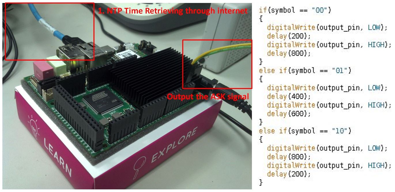 韌體層的實作方式是採用UDOO單板電腦上整合的Arduino Due (Atmel SAM3X8E MCU),透過tty序列界面與UDOO單板電腦溝通,當UDOO單板電腦送達公眾資訊、時間資訊與同步位元後,Arduino Due編譯出120bits的編碼出120bits的編碼,並透過我們撰寫在內部的韌體進行Amplitude-Shift-Keying,以類似Pulse-Width-Modulation的形式將這些位元碼轉成High-Low形式的訊號,如圖3c所示。